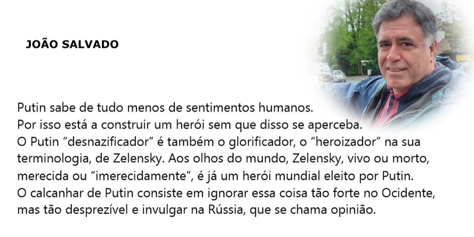 As opiniões sobre esta guerra de um realizador de televisão, um jornalista, um militar da GNR e uma professora universitária. Um misto de desencanto e sarcasmo.