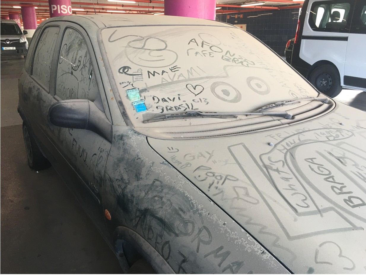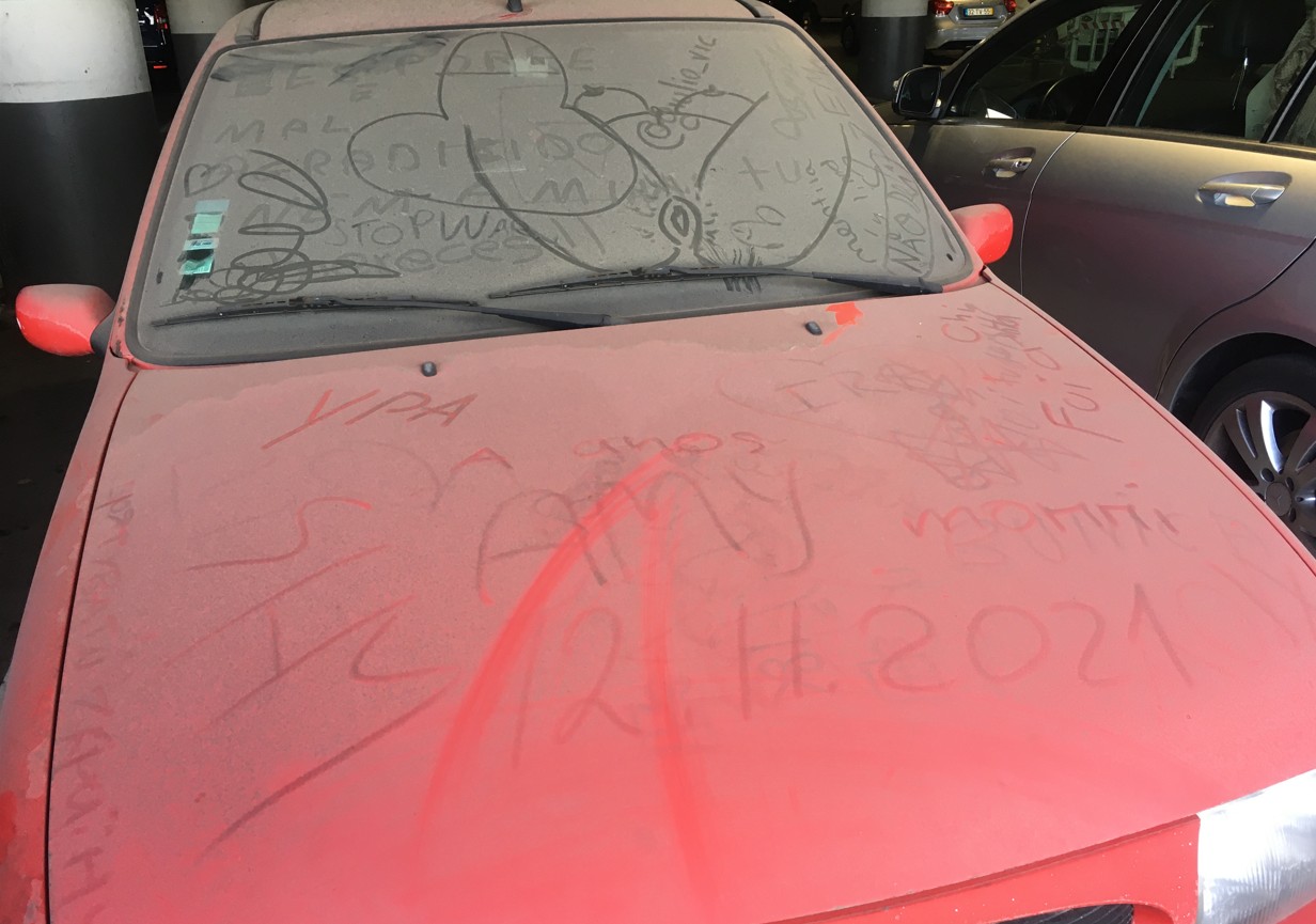 O abandono é evidente. O tempo encarrega-se de tapar a cor da tinta, o pó torna tudo cinzento. E há quem se entretenha a ensaiar expressões artísticas ou mensagens para os vindouros. Alguns veículos têm inscrições datadas de há anos. Como o estacionamento tem teto, não há chuva que lave os automóveis.