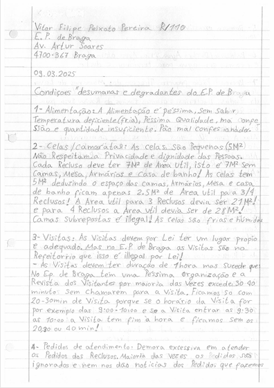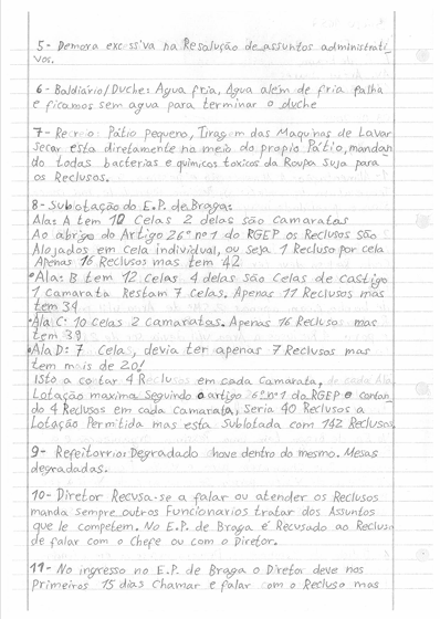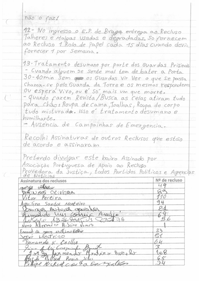 Para lá do muro branco na Avenida Artur Soares, em Braga, numa porta metálica sem número, estão 91 pessoas que reclamam por tratamento digno. Podem ser mais, porque segundo dizem os reclusos, a cadeia está sobrelotada. Mas 91 desses reclusos assinaram o abaixo assinado que divulgaram através da Associação Portuguesa de Apoio ao recluso (APAR), com o pedido expresso de ser divulgado pelos órgãos de comunicação social.