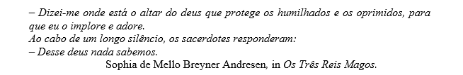 O “Rei Baltasar” que governa o meu país, os príncipes que ele chamou para conselheiros, os chefes dos guardas, os ministros todos que ele tem e os representantes que levou das províncias ou nelas deixou, não têm descido à rua, parece, e se descem os seus carros passam de cortinas corridas e nenhum deles vê as desgraças que Baltasar viu quando desceu e peregrinou entre o seu povo.