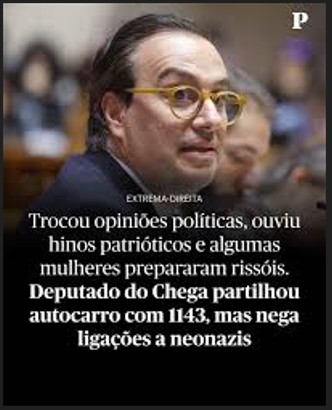 Por fim, a promiscuidade com meios neonazis. O grupo 1143, dirigido por Mário Machado, surgiu em investigações recentes relacionadas com atividades extremistas, de índole terrorista. O requerimento realça as ligações públicas, os apoios declarados e as presenças cruzadas em manifestações. Não é necessário que exista fusão orgânica para que exista afinidade política operacional. A história europeia ensina que partidos institucionalizados e milícias radicais muitas vezes caminham lado a lado antes de formalizarem qualquer união.