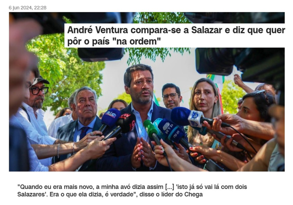 O discurso recorrente contra “os últimos 50 anos”, isto é, contra o período democrático não é inocente. A referência elogiosa a Salazar, a defesa de soluções penais extremas, a retórica de “limpeza” moral do sistema, a invocação permanente de “Deus, Pátria e Família” compõem um imaginário político que não nasceu ontem.