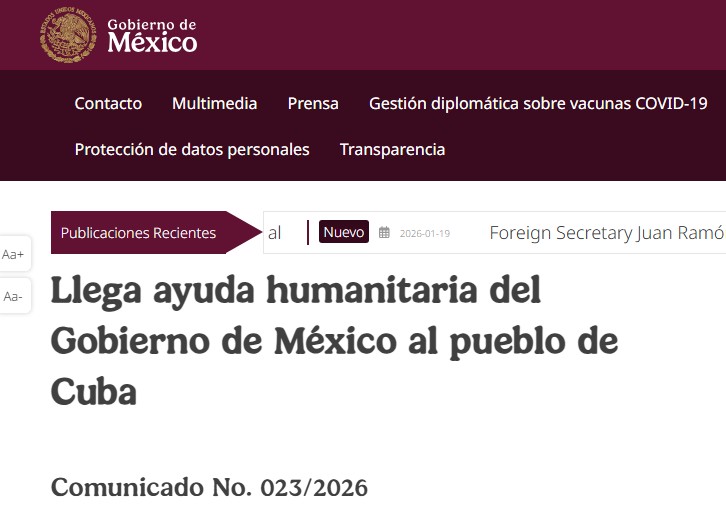 recorte da página do site do Governo do México sobre envio de ajuda humanitária para Cuba