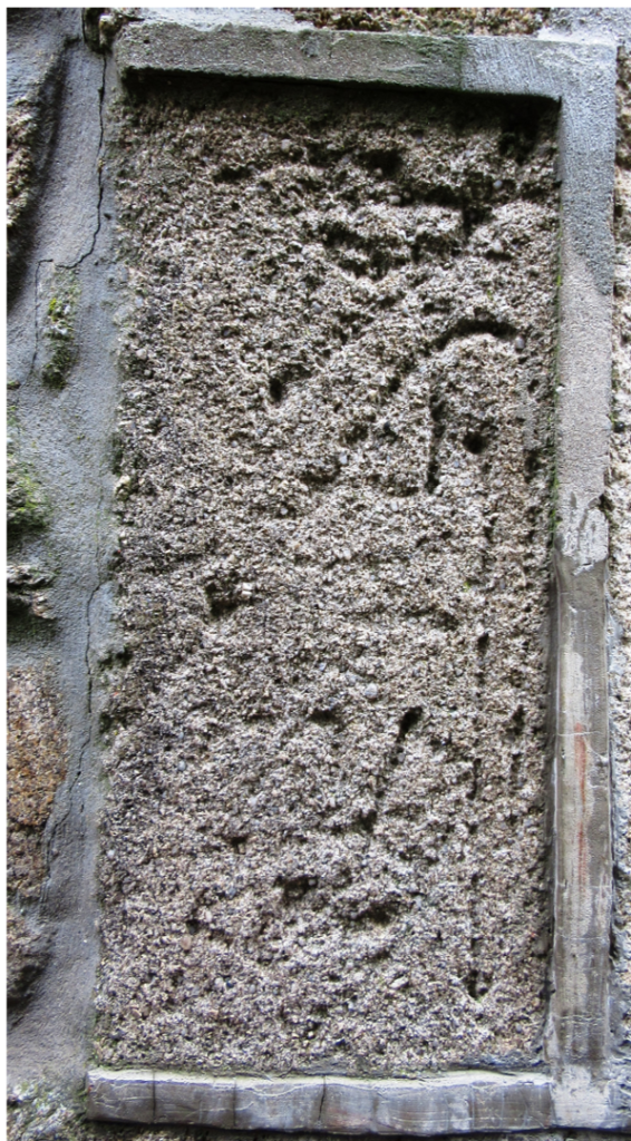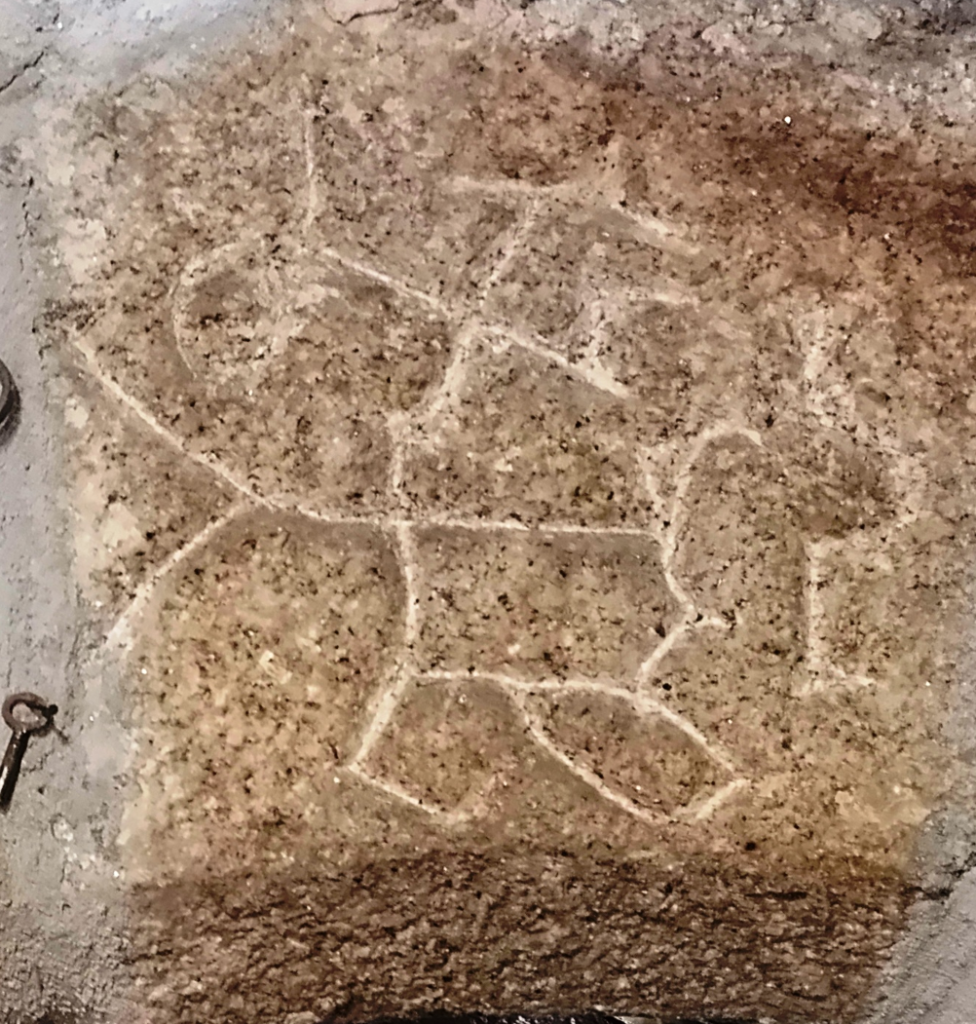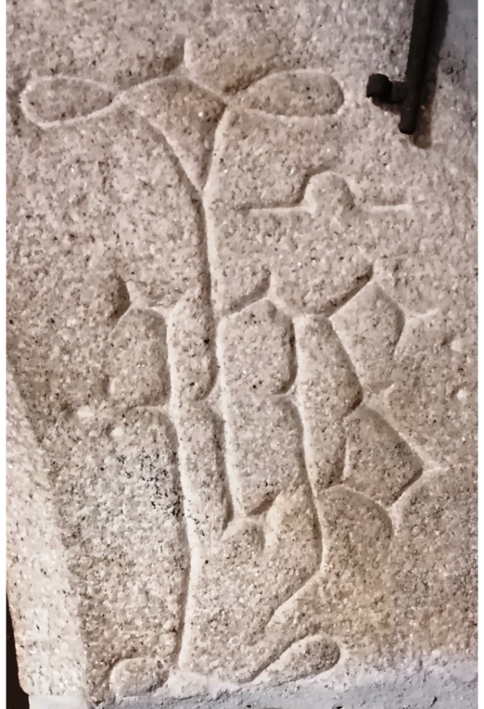 Em cima, na pedra de fecho da ogiva, à esquerda, os riscos aí gravados poderão interpretar-se como a representação esquemática de um animal de carga (muar ou burro): a cauda em forma de ípsilon (Y) deitado para trás, as patas em jeito de elipses oblongas.