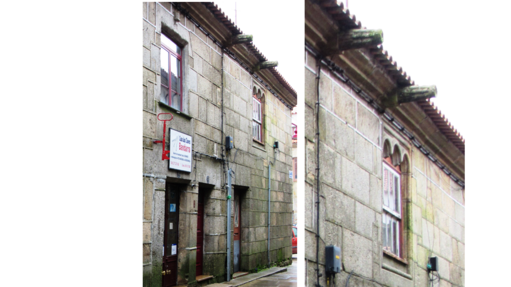 A essoutros já vamos, porque importa esclarecer esse de haver um arco de entrada… dentro! De facto, numa grande quantidade de edifícios antigos, sobretudo com fachadas dos séc. XVI e XVII, que hoje nos é dado observar, sempre que os seus interiores foram intervencionados nas últimas décadas, aparecem as fachadas iniciais, dos séc. XIII e XIV, que é o caso. A entremear estas fachadas e as posteriores, existe sempre a calçada da rua. Umas vezes, os proprietários mantêm os vestígios da calçada; outras, tapam-na com novo pavimento. Esta evidência denuncia que o urbanismo medieval primitivo foi sendo alterado, dando a entender que os edifícios se ampliavam para o espaço público (rua), o que parece contrariar a ideia de as ruas da cidade terem sido de largura reduzida (2 a 4 metros).