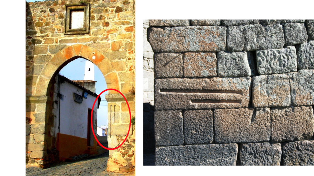 Nesse frontispício, nos chamaram, todavia, particular atenção os ‘arabescos’ preservados junto de uma das portas, em pedra emoldurada a preceito. Não ousamos atribuir-lhe significado; alicia-nos, contudo, ver nos dois sulcos verticais, à direita, a representação da vara e do côvado, como há na Porta da Ravessa da vila alentejana de Redondo e na célebre Porta Nova de Sortelha, concelho do Sabugal, a representação das medidas-padrão da época medieval, utilizadas para aferição prática de mercadorias e controlo comercial à entrada da povoação.