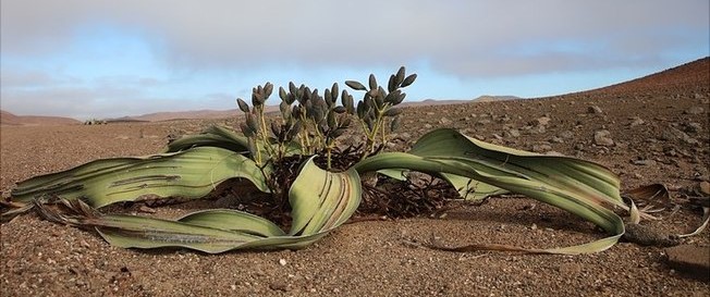 Endémica do sul de Angola e do norte da Namíbia, a Welwitschia é, à sua maneira, minimalista: passa a vida inteira com apenas duas folhas. Duas. Nem uma, nem três, nem um conjunto elegante de ramos. Apenas duas folhas teimosas que crescem continuamente a partir da base, podem atingir os 4 metros, podendo a planta ultrapassar os mil anos de idade. O vento encarrega-se de as rasgar e torcer, dando-lhe aquele aspeto de desalinhado de quem acordou há séculos e ainda não teve tempo de se pentear. Para outros, esta planta parece um polvo.
